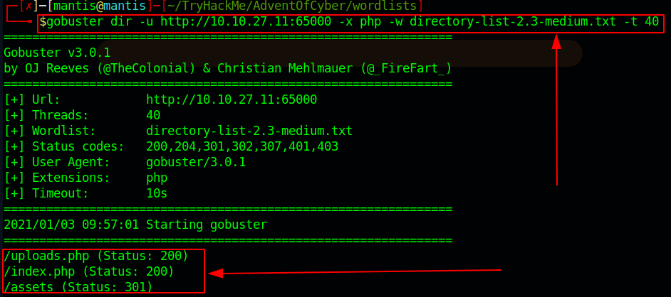 Gobuster syntax ex:gobuster dir -u http://10.10.27.11:65000 -x php -w directory-list-2.3-medium.txt -t 40