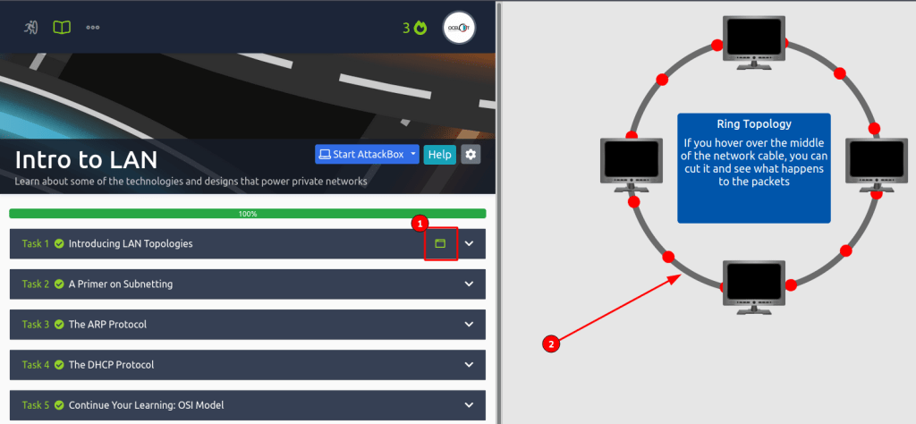 Make sure to read all of the information and take notes! If you ever get stuck there is a great official THM Discord where people are always around to help. Be on the lookout for that little green box (1), it means that you can interact with something in that section! What do you think would happen if we took a pair of scissors to #2?