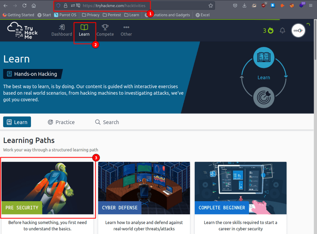 First create a free account at TryHackMe and then navigate over to the Learn tab. Once there you will see several different learning paths, each with something different to offer. Like our title says lets go to the Pre-Security Path here.