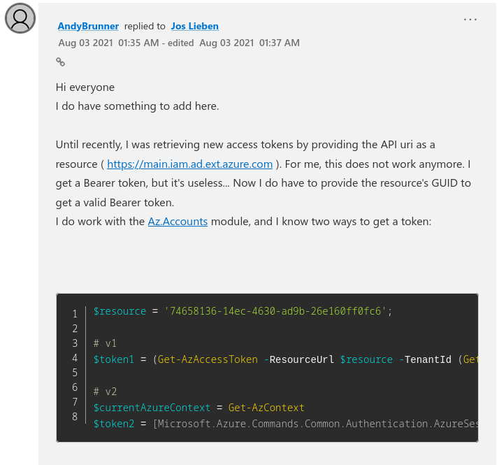 This however resulted in a 401 Unauthorized, the account that I was using was for a Global Administrator so I didn’t think that it was a permissions issue.
