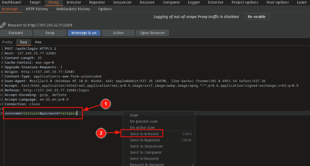 Once you hit LOGIN minimize the browser and look at the Proxy Intercept page. You are looking for a field with your username and password. NOTE: You may need to press FORWARD several times to see this request. Once you see it Right Click and select Send To Intruder.