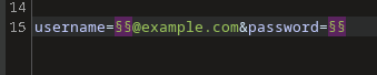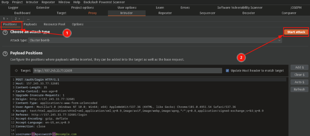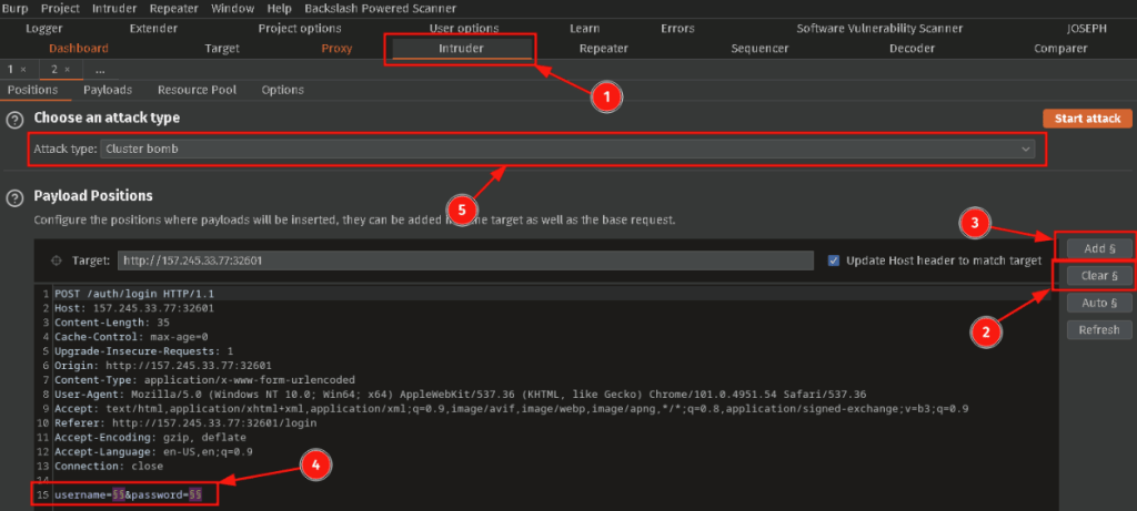 Navigate to the Intruder tab and verify that you see the testuser and testpassword. Press the Clear § button, and then use the Add § button to insert that special character around your username and password. Delete the testuser and testpassword so all that you are left with are 4 § signs. Set the Attack Type to Cluster Bomb.