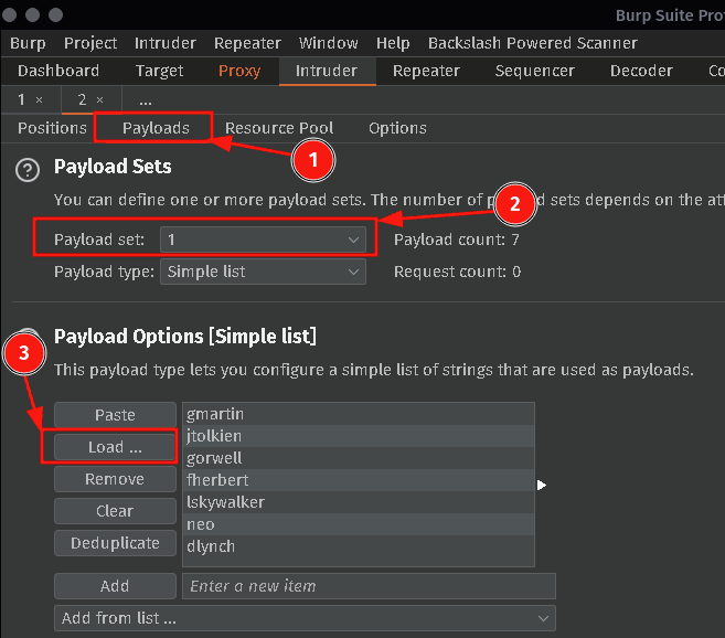 Select the Payloads tab and load in a list of usernames that you recovered from recon. You can also Paste in names you have found or Add some manually. Ensure the Payload Set is 1. Depending on the login page you are either going to enter a direct username, or a username@example.com. Either way I prefer to load in the usernames and append the @example.com in the Positions Tab if it is required. (sometimes the login page will even just give you the syntax if you submit a blank request)