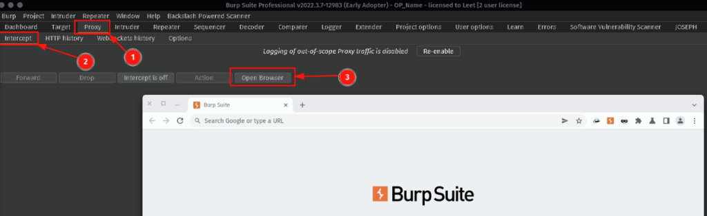 If you are using Burpsuite Professional open the Burpsuite built in browser. Go to the Proxy tab, Intercept, and click on Open Browser. If not, you are going to need to download and configure a foxyproxy web plugin for your browser.